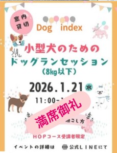 【満席御礼 小型犬ドッグランセッション】 早速のお申込、ありがとうございました。 以降、キャンセル待ちを承ります。 ご希望の方は、公式LINEにて お申込下さい。 |